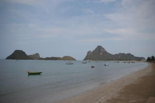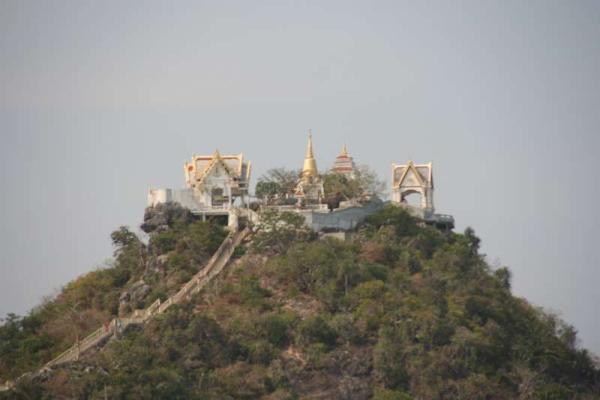 Noch ein paar Dinge zu Prachuap Khiri Khan, das wir bereits gestern verlassen haben. Die kleine Stadt bietet nicht viel ausser einer herrlichen Kulisse, die aus 2 Buchten besteht. Diese werden von einigen bewachsenen Bergen, die im Wasser stehen gebildet. Es gibt ein Hotel, das von einem Deutschen Ossi geführt wird. Ein weiterer Deutscher hat mit seiner Thaifrau zusammen ein kleineres Guesthouse aufgemacht. Wobei seine Tätigkeit aus Bier trinken und Musik machen besteht... Am nördlichen Ende des Dorfes gibt es einen Wat auf einem Hügel von 80 Metern. Unser Plan war klar: Wir müssen da hoch.
